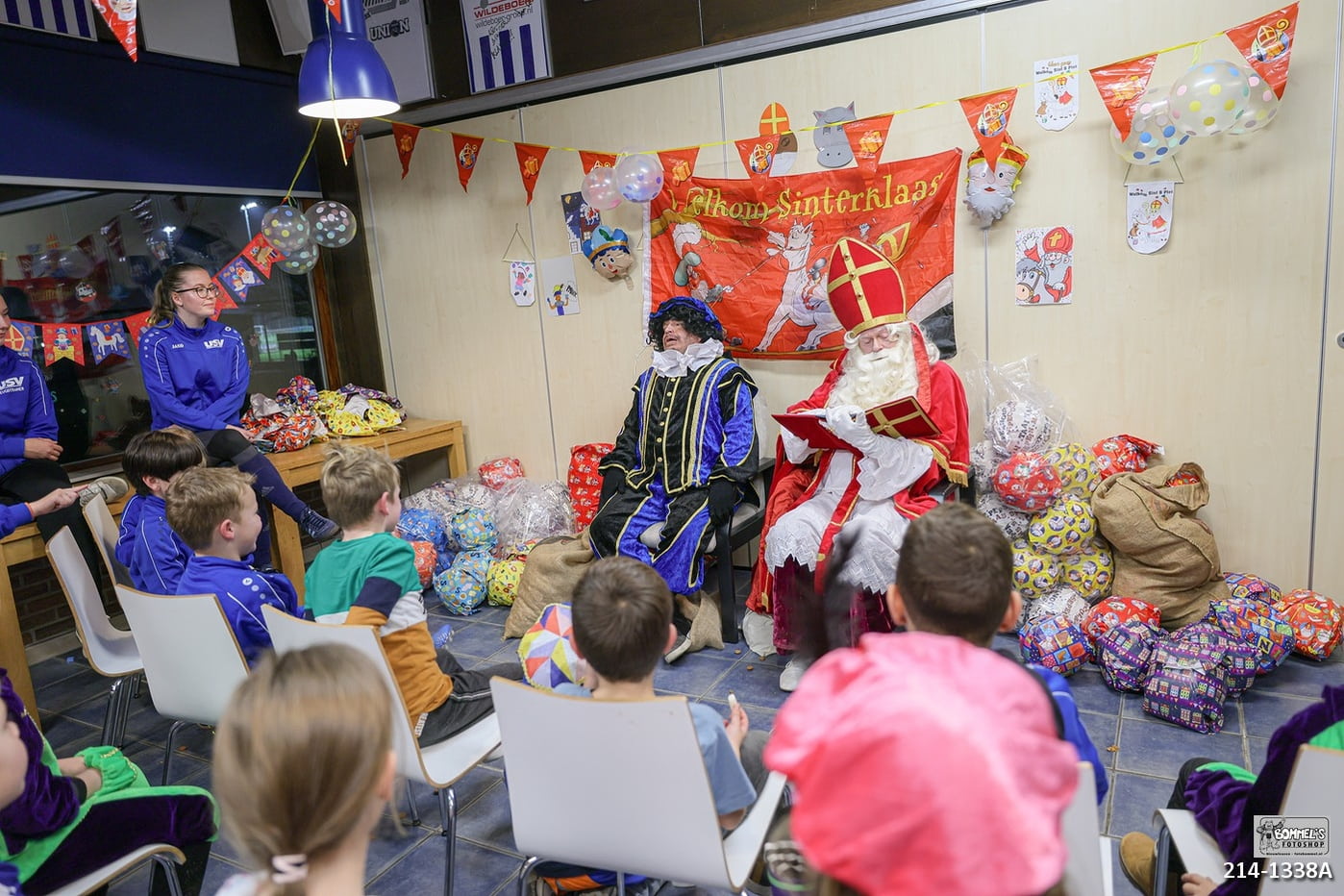 Extra bijzonder dit jaar: er waren drie speciale Voetbalpieten. Zij toonden hun geweldige skills bij de teams van O8 en O9. Die gingen daarna in het clubgebouw op bezoek bij Sinterklaas. Daar waren ook de Kabouters en de O7. Zij hadden intussen al uitgebreid kennisgemaakt met en gezongen voor de Sint. Natuurlijk waren er ook cadeaus. Zo had de Sint een echte USV-bal uit Spanje meegenomen. Er waren pepernoten, heel veel pepernoten. Maar ook werden er lekkere wafels met slagroom versierd. Dag Sinterklaasje en Pieten, bedankt voor het bezoek aan USV en hopelijk tot volgend jaar.